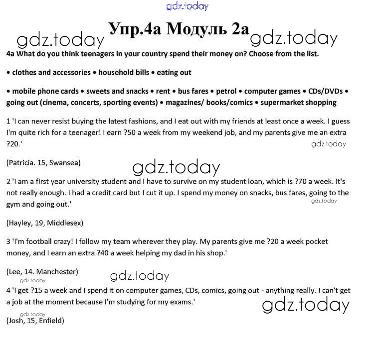 На страницах сайта gdz.today вы найдете учебный и вспомогательный материал, направленный на улучшения знаний школьной программы. ГДЗ - онлайн мир знаний Часть 2a Решение к Module 2 4a Учебнику по Английскому языку для 10 класса Афанасьева, Дули Просвещение Spotlight 2015