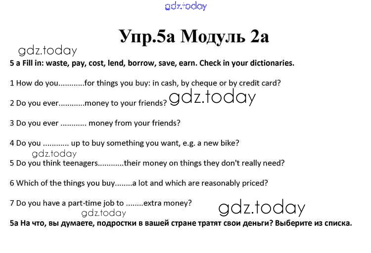 На страницах сайта gdz.today вы найдете учебный и вспомогательный материал, направленный на улучшения знаний школьной программы. ГДЗ - онлайн мир знаний Часть 2a Решение к Module 2 5a Учебнику по Английскому языку для 10 класса Афанасьева, Дули Просвещение Spotlight 2015