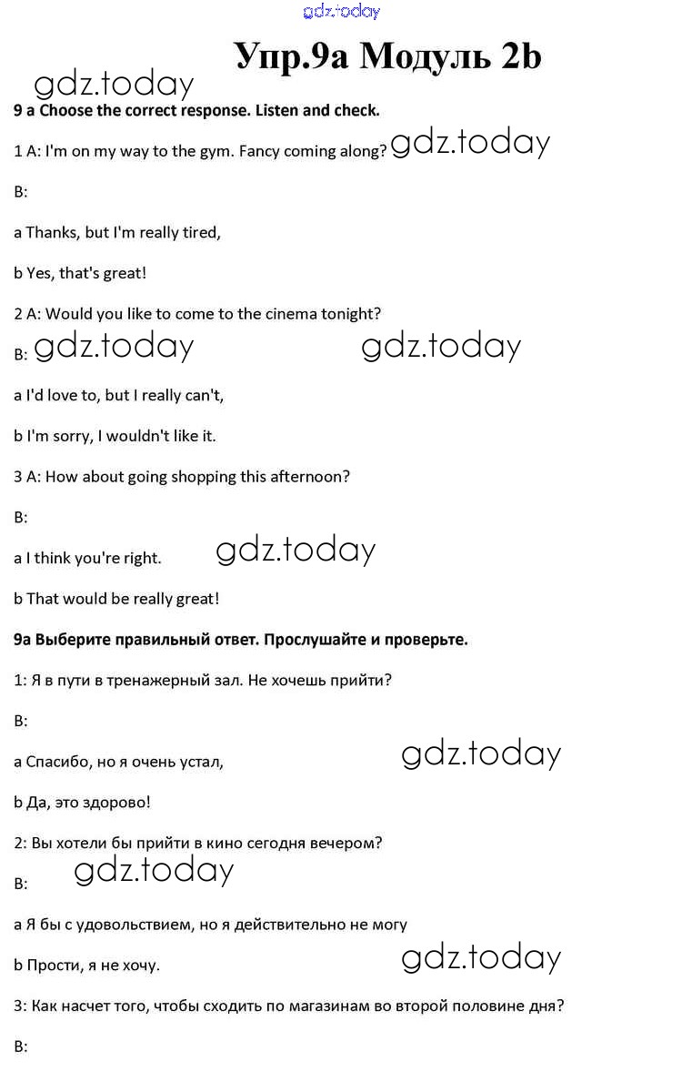 На страницах сайта gdz.today вы найдете учебный и вспомогательный материал, направленный на улучшения знаний школьной программы. ГДЗ - онлайн мир знаний Часть 2b Решение к Module 2 9a Учебнику по Английскому языку для 10 класса Афанасьева, Дули Просвещение Spotlight 2015