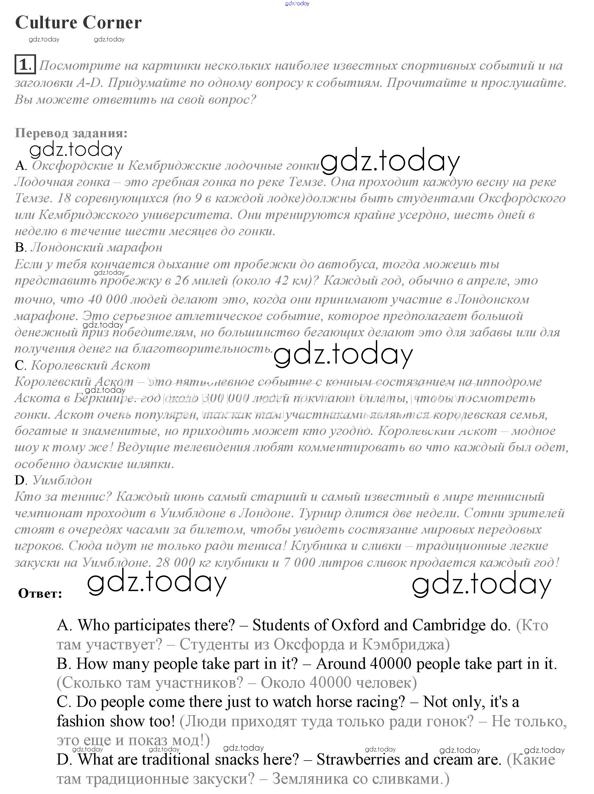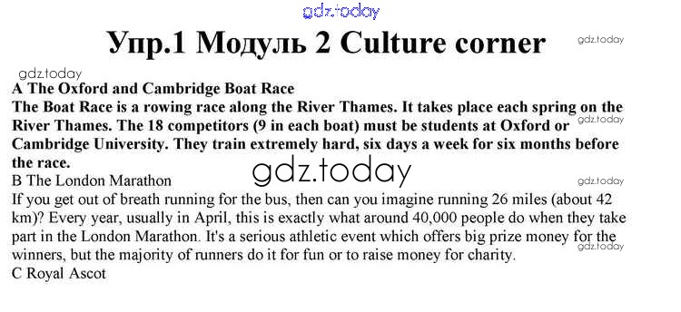 На страницах сайта gdz.today вы найдете учебный и вспомогательный материал, направленный на улучшения знаний школьной программы. ГДЗ - онлайн мир знаний Culture corner Решение к Module 2 1 Учебнику по Английскому языку для 10 класса Афанасьева, Дули Просвещение Spotlight 2015