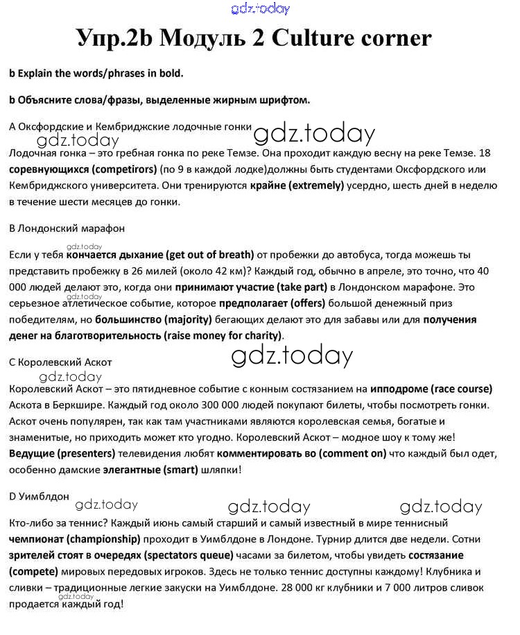 На страницах сайта gdz.today вы найдете учебный и вспомогательный материал, направленный на улучшения знаний школьной программы. ГДЗ - онлайн мир знаний Culture corner Решение к Module 2 2b Учебнику по Английскому языку для 10 класса Афанасьева, Дули Просвещение Spotlight 2015