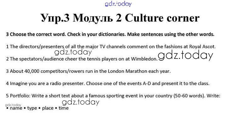 На страницах сайта gdz.today вы найдете учебный и вспомогательный материал, направленный на улучшения знаний школьной программы. ГДЗ - онлайн мир знаний Culture corner Решение к Module 2 3 Учебнику по Английскому языку для 10 класса Афанасьева, Дули Просвещение Spotlight 2015