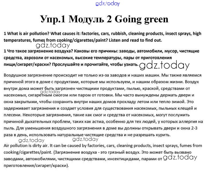 На страницах сайта gdz.today вы найдете учебный и вспомогательный материал, направленный на улучшения знаний школьной программы. ГДЗ - онлайн мир знаний Going green Решение к Module 2 1 Учебнику по Английскому языку для 10 класса Афанасьева, Дули Просвещение Spotlight 2015