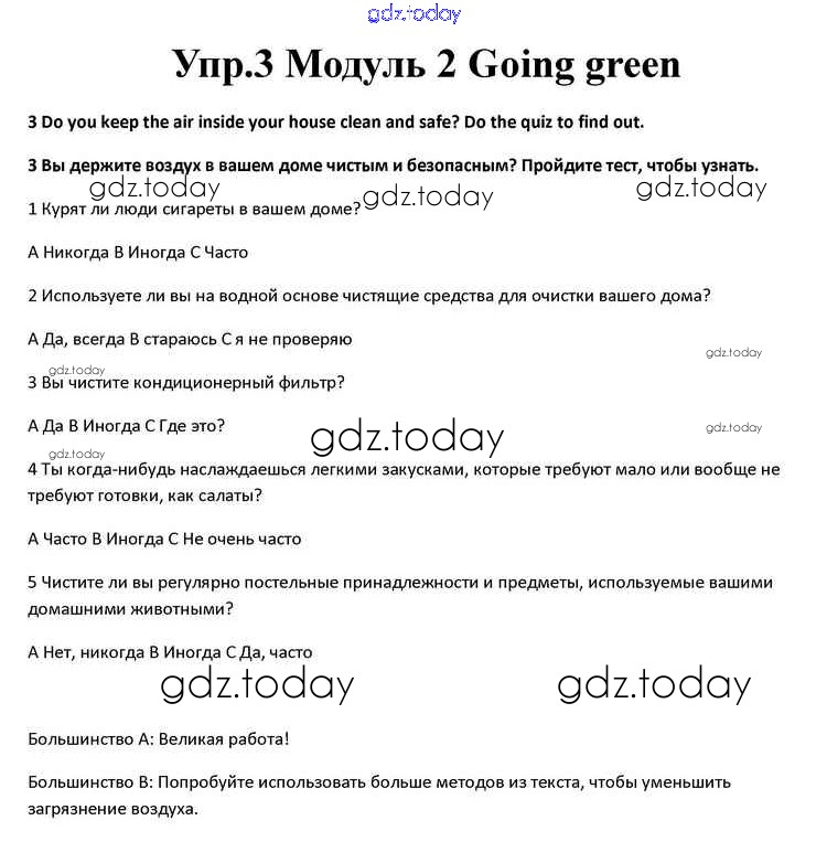 На страницах сайта gdz.today вы найдете учебный и вспомогательный материал, направленный на улучшения знаний школьной программы. ГДЗ - онлайн мир знаний Going green Решение к Module 2 3 Учебнику по Английскому языку для 10 класса Афанасьева, Дули Просвещение Spotlight 2015