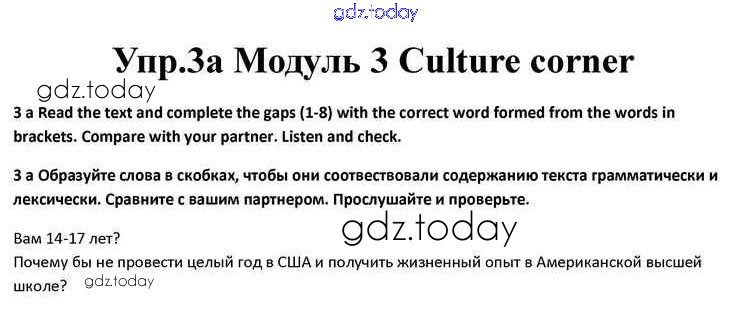 На страницах сайта gdz.today вы найдете учебный и вспомогательный материал, направленный на улучшения знаний школьной программы. ГДЗ - онлайн мир знаний Culture corner Решение к Module 3 3a Учебнику по Английскому языку для 10 класса Афанасьева, Дули Просвещение Spotlight 2015