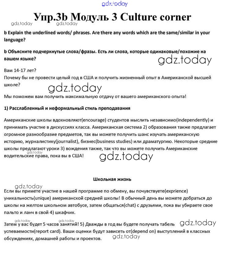 На страницах сайта gdz.today вы найдете учебный и вспомогательный материал, направленный на улучшения знаний школьной программы. ГДЗ - онлайн мир знаний Culture corner Решение к Module 3 3b Учебнику по Английскому языку для 10 класса Афанасьева, Дули Просвещение Spotlight 2015