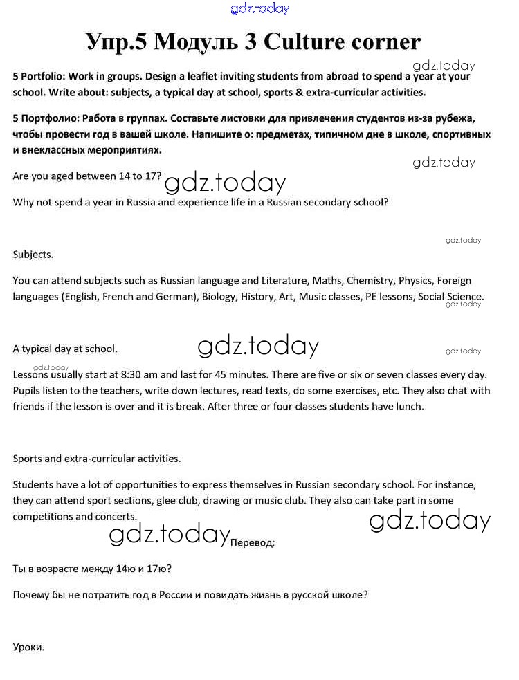 На страницах сайта gdz.today вы найдете учебный и вспомогательный материал, направленный на улучшения знаний школьной программы. ГДЗ - онлайн мир знаний Culture corner Решение к Module 3 5 Учебнику по Английскому языку для 10 класса Афанасьева, Дули Просвещение Spotlight 2015