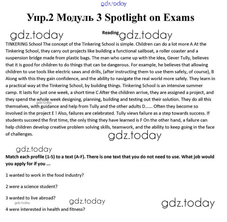 На страницах сайта gdz.today вы найдете учебный и вспомогательный материал, направленный на улучшения знаний школьной программы. ГДЗ - онлайн мир знаний Spotlight on Exams Решение к Module 3 2 Учебнику по Английскому языку для 10 класса Афанасьева, Дули Просвещение Spotlight 2015