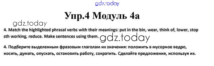 На страницах сайта gdz.today вы найдете учебный и вспомогательный материал, направленный на улучшения знаний школьной программы. ГДЗ - онлайн мир знаний Часть 4a Решение к Module 4 4 Учебнику по Английскому языку для 10 класса Афанасьева, Дули Просвещение Spotlight 2015