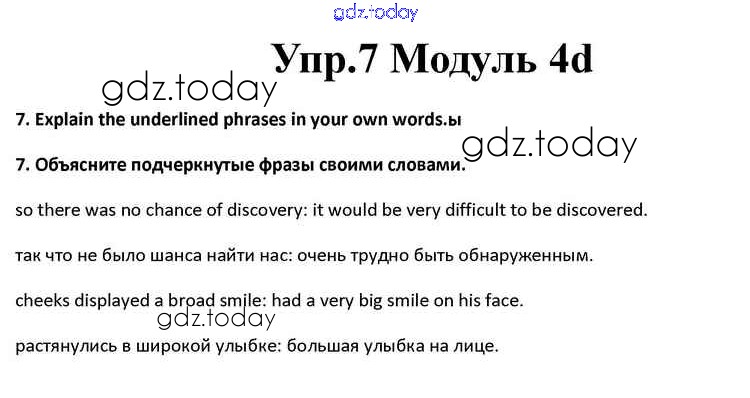 На страницах сайта gdz.today вы найдете учебный и вспомогательный материал, направленный на улучшения знаний школьной программы. ГДЗ - онлайн мир знаний Часть 4d Решение к Module 4 7 Учебнику по Английскому языку для 10 класса Афанасьева, Дули Просвещение Spotlight 2015