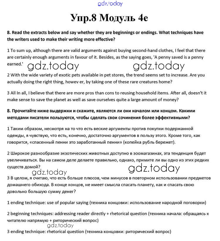 На страницах сайта gdz.today вы найдете учебный и вспомогательный материал, направленный на улучшения знаний школьной программы. ГДЗ - онлайн мир знаний Часть 4e Решение к Module 4 8 Учебнику по Английскому языку для 10 класса Афанасьева, Дули Просвещение Spotlight 2015
