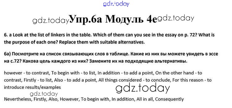 На страницах сайта gdz.today вы найдете учебный и вспомогательный материал, направленный на улучшения знаний школьной программы. ГДЗ - онлайн мир знаний Часть 4e Решение к Module 4 6a Учебнику по Английскому языку для 10 класса Афанасьева, Дули Просвещение Spotlight 2015