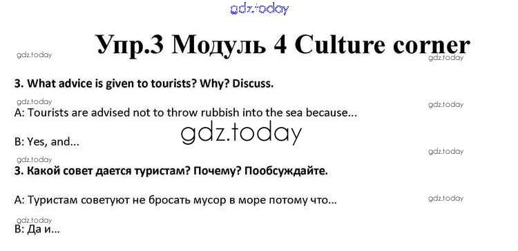 На страницах сайта gdz.today вы найдете учебный и вспомогательный материал, направленный на улучшения знаний школьной программы. ГДЗ - онлайн мир знаний Culture corner Решение к Module 4 3 Учебнику по Английскому языку для 10 класса Афанасьева, Дули Просвещение Spotlight 2015