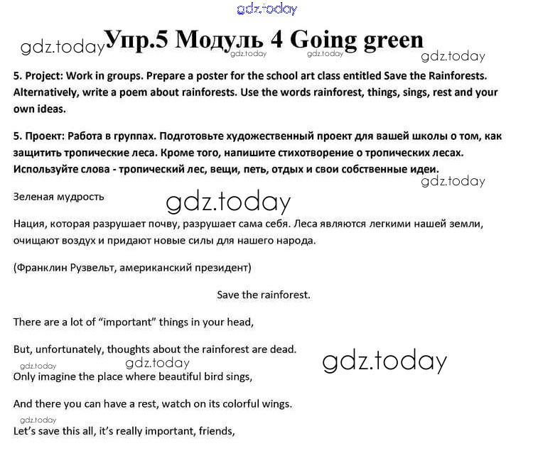 На страницах сайта gdz.today вы найдете учебный и вспомогательный материал, направленный на улучшения знаний школьной программы. ГДЗ - онлайн мир знаний Going green Решение к Module 4 5 Учебнику по Английскому языку для 10 класса Афанасьева, Дули Просвещение Spotlight 2015