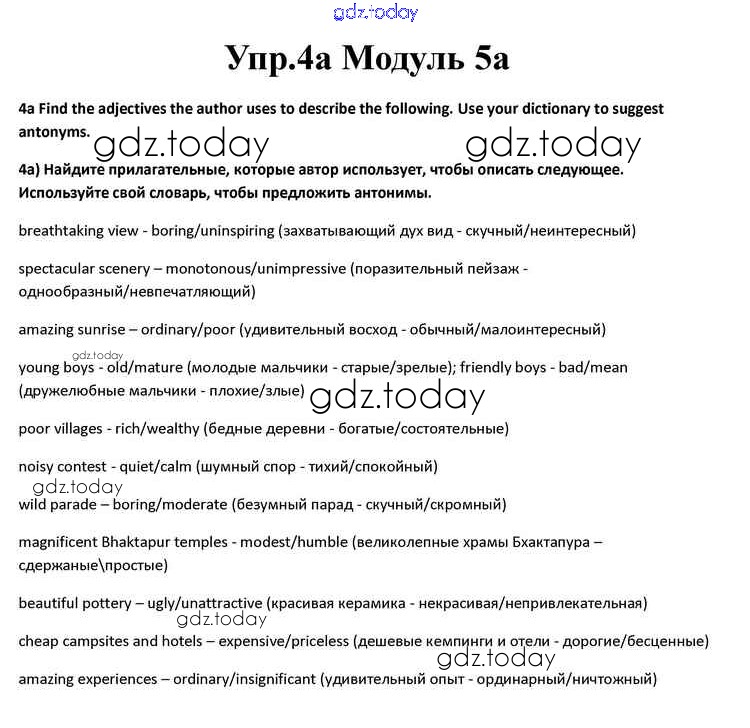 На страницах сайта gdz.today вы найдете учебный и вспомогательный материал, направленный на улучшения знаний школьной программы. ГДЗ - онлайн мир знаний Часть 5a Решение к Module 5 4a Учебнику по Английскому языку для 10 класса Афанасьева, Дули Просвещение Spotlight 2015