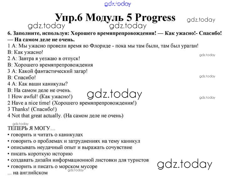 На страницах сайта gdz.today вы найдете учебный и вспомогательный материал, направленный на улучшения знаний школьной программы. ГДЗ - онлайн мир знаний Progress Check Решение к Module 5 6 Учебнику по Английскому языку для 10 класса Афанасьева, Дули Просвещение Spotlight 2015