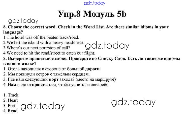 На страницах сайта gdz.today вы найдете учебный и вспомогательный материал, направленный на улучшения знаний школьной программы. ГДЗ - онлайн мир знаний Часть 5b Решение к Module 5 8 Учебнику по Английскому языку для 10 класса Афанасьева, Дули Просвещение Spotlight 2015