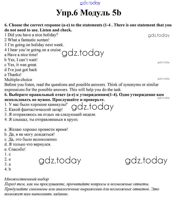 На страницах сайта gdz.today вы найдете учебный и вспомогательный материал, направленный на улучшения знаний школьной программы. ГДЗ - онлайн мир знаний Часть 5b Решение к Module 5 6 Учебнику по Английскому языку для 10 класса Афанасьева, Дули Просвещение Spotlight 2015