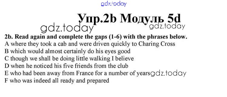 На страницах сайта gdz.today вы найдете учебный и вспомогательный материал, направленный на улучшения знаний школьной программы. ГДЗ - онлайн мир знаний Часть 5d Решение к Module 5 2b Учебнику по Английскому языку для 10 класса Афанасьева, Дули Просвещение Spotlight 2015