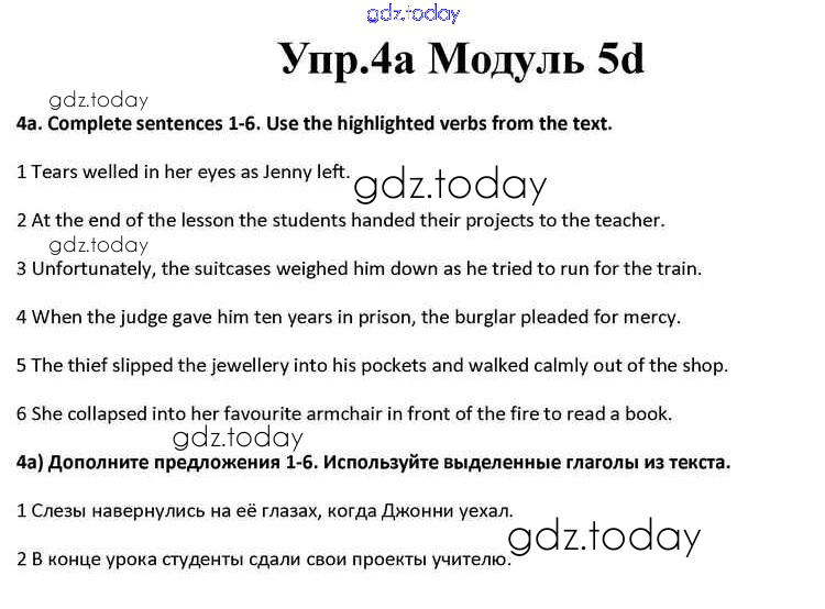 На страницах сайта gdz.today вы найдете учебный и вспомогательный материал, направленный на улучшения знаний школьной программы. ГДЗ - онлайн мир знаний Часть 5d Решение к Module 5 4a Учебнику по Английскому языку для 10 класса Афанасьева, Дули Просвещение Spotlight 2015