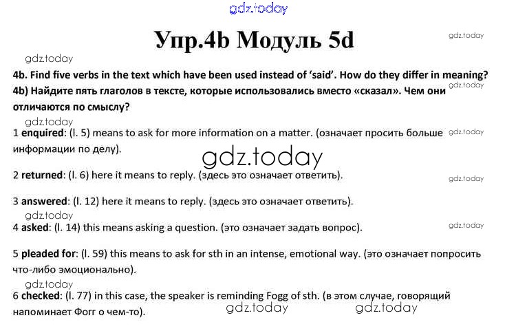 На страницах сайта gdz.today вы найдете учебный и вспомогательный материал, направленный на улучшения знаний школьной программы. ГДЗ - онлайн мир знаний Часть 5d Решение к Module 5 4b Учебнику по Английскому языку для 10 класса Афанасьева, Дули Просвещение Spotlight 2015
