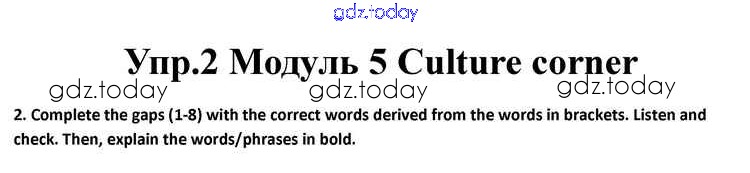 На страницах сайта gdz.today вы найдете учебный и вспомогательный материал, направленный на улучшения знаний школьной программы. ГДЗ - онлайн мир знаний Culture corner Решение к Module 5 2 Учебнику по Английскому языку для 10 класса Афанасьева, Дули Просвещение Spotlight 2015