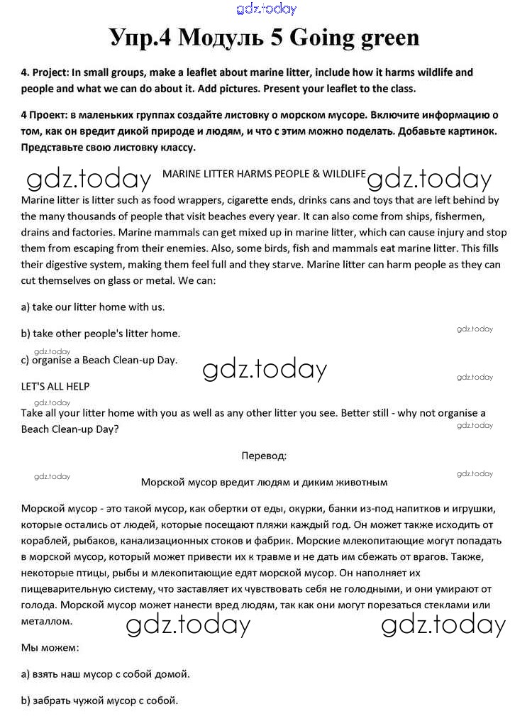На страницах сайта gdz.today вы найдете учебный и вспомогательный материал, направленный на улучшения знаний школьной программы. ГДЗ - онлайн мир знаний Going green Решение к Module 5 4 Учебнику по Английскому языку для 10 класса Афанасьева, Дули Просвещение Spotlight 2015