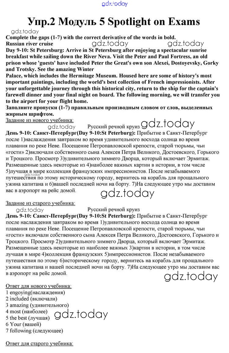 На страницах сайта gdz.today вы найдете учебный и вспомогательный материал, направленный на улучшения знаний школьной программы. ГДЗ - онлайн мир знаний Spotlight on Exams Решение к Module 5 2 Учебнику по Английскому языку для 10 класса Афанасьева, Дули Просвещение Spotlight 2015