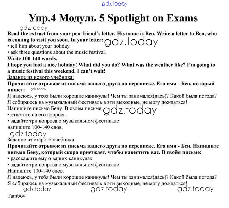 На страницах сайта gdz.today вы найдете учебный и вспомогательный материал, направленный на улучшения знаний школьной программы. ГДЗ - онлайн мир знаний Spotlight on Exams Решение к Module 5 4 Учебнику по Английскому языку для 10 класса Афанасьева, Дули Просвещение Spotlight 2015