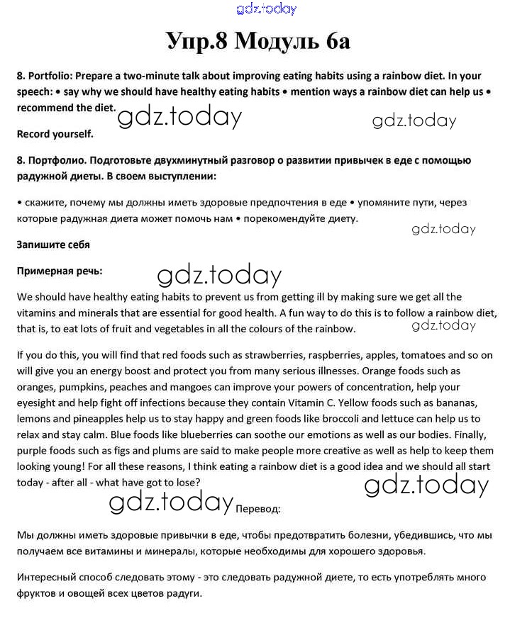 На страницах сайта gdz.today вы найдете учебный и вспомогательный материал, направленный на улучшения знаний школьной программы. ГДЗ - онлайн мир знаний Часть 6a Решение к Module 6 8 Учебнику по Английскому языку для 10 класса Афанасьева, Дули Просвещение Spotlight 2015