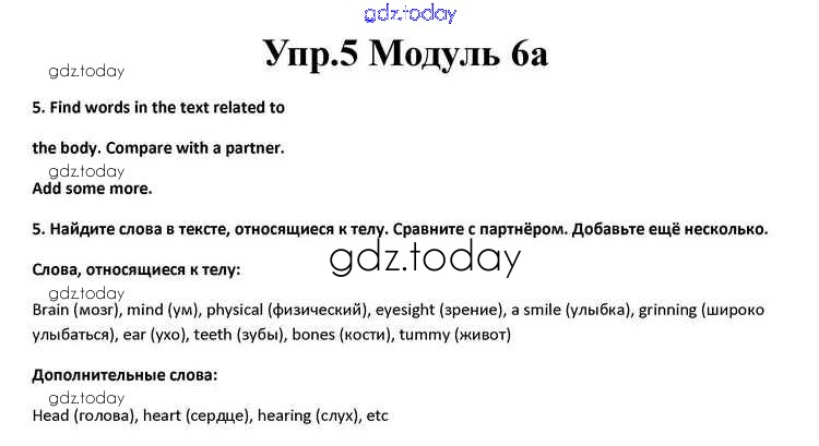 На страницах сайта gdz.today вы найдете учебный и вспомогательный материал, направленный на улучшения знаний школьной программы. ГДЗ - онлайн мир знаний Часть 6a Решение к Module 6 5 Учебнику по Английскому языку для 10 класса Афанасьева, Дули Просвещение Spotlight 2015