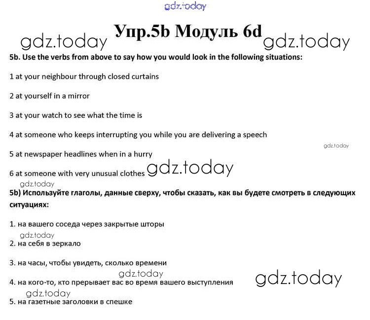На страницах сайта gdz.today вы найдете учебный и вспомогательный материал, направленный на улучшения знаний школьной программы. ГДЗ - онлайн мир знаний Часть 6d Решение к Module 6 5b Учебнику по Английскому языку для 10 класса Афанасьева, Дули Просвещение Spotlight 2015