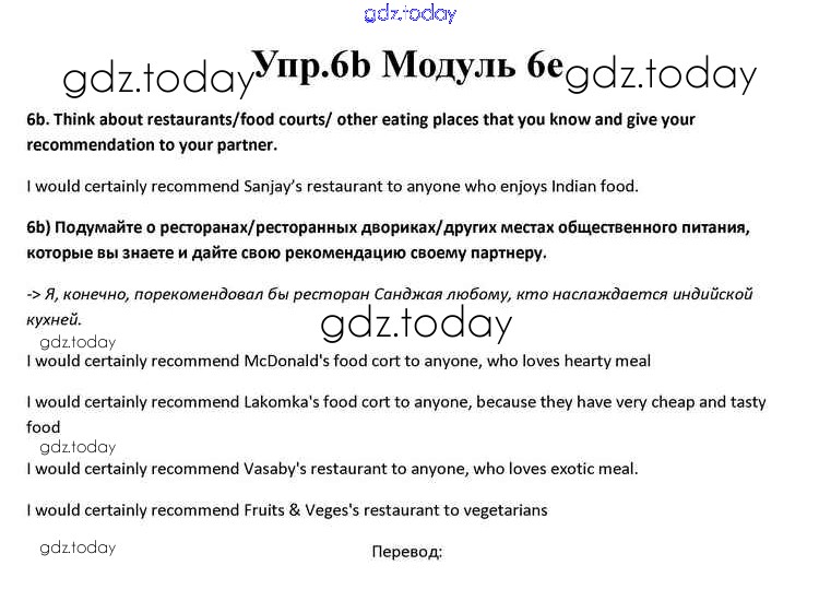 На страницах сайта gdz.today вы найдете учебный и вспомогательный материал, направленный на улучшения знаний школьной программы. ГДЗ - онлайн мир знаний Часть 6e Решение к Module 6 6b Учебнику по Английскому языку для 10 класса Афанасьева, Дули Просвещение Spotlight 2015