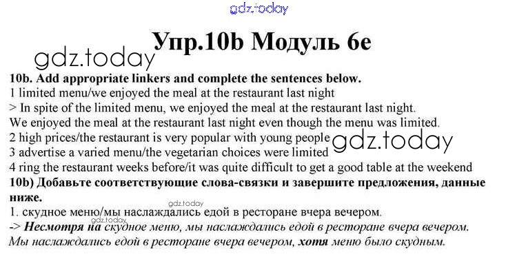На страницах сайта gdz.today вы найдете учебный и вспомогательный материал, направленный на улучшения знаний школьной программы. ГДЗ - онлайн мир знаний Часть 6e Решение к Module 6 10b Учебнику по Английскому языку для 10 класса Афанасьева, Дули Просвещение Spotlight 2015