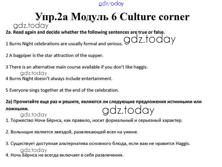 На страницах сайта gdz.today вы найдете учебный и вспомогательный материал, направленный на улучшения знаний школьной программы. ГДЗ - онлайн мир знаний Culture corner Решение к Module 6 2a Учебнику по Английскому языку для 10 класса Афанасьева, Дули Просвещение Spotlight 2015
