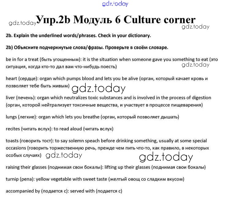 На страницах сайта gdz.today вы найдете учебный и вспомогательный материал, направленный на улучшения знаний школьной программы. ГДЗ - онлайн мир знаний Culture corner Решение к Module 6 2b Учебнику по Английскому языку для 10 класса Афанасьева, Дули Просвещение Spotlight 2015