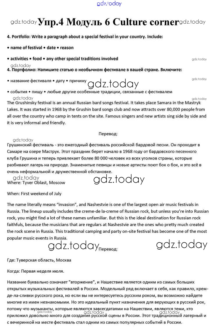 На страницах сайта gdz.today вы найдете учебный и вспомогательный материал, направленный на улучшения знаний школьной программы. ГДЗ - онлайн мир знаний Culture corner Решение к Module 6 4 Учебнику по Английскому языку для 10 класса Афанасьева, Дули Просвещение Spotlight 2015