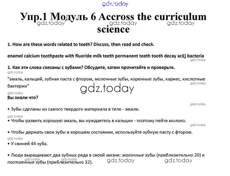 На страницах сайта gdz.today вы найдете учебный и вспомогательный материал, направленный на улучшения знаний школьной программы. ГДЗ - онлайн мир знаний Accross the curriculum Science Решение к Module 6 1 Учебнику по Английскому языку для 10 класса Афанасьева, Дули Просвещение Spotlight 2015