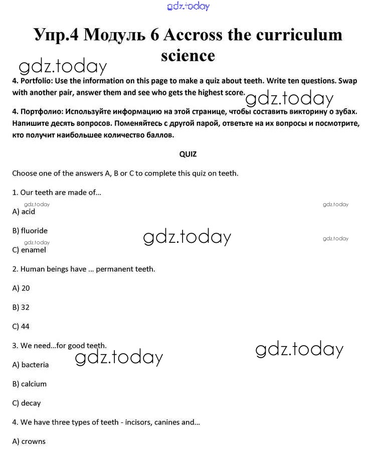 На страницах сайта gdz.today вы найдете учебный и вспомогательный материал, направленный на улучшения знаний школьной программы. ГДЗ - онлайн мир знаний Accross the curriculum Science Решение к Module 6 4 Учебнику по Английскому языку для 10 класса Афанасьева, Дули Просвещение Spotlight 2015