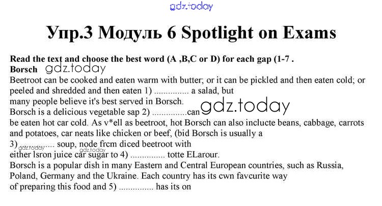 На страницах сайта gdz.today вы найдете учебный и вспомогательный материал, направленный на улучшения знаний школьной программы. ГДЗ - онлайн мир знаний Spotlight on Exams Решение к Module 6 3 Учебнику по Английскому языку для 10 класса Афанасьева, Дули Просвещение Spotlight 2015