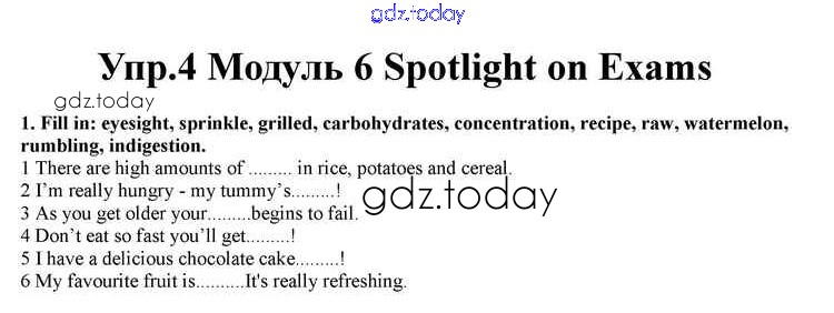 На страницах сайта gdz.today вы найдете учебный и вспомогательный материал, направленный на улучшения знаний школьной программы. ГДЗ - онлайн мир знаний Spotlight on Exams Решение к Module 6 4 Учебнику по Английскому языку для 10 класса Афанасьева, Дули Просвещение Spotlight 2015