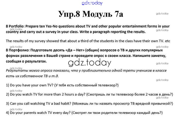 На страницах сайта gdz.today вы найдете учебный и вспомогательный материал, направленный на улучшения знаний школьной программы. ГДЗ - онлайн мир знаний Часть 7a Решение к Module 7 8 Учебнику по Английскому языку для 10 класса Афанасьева, Дули Просвещение Spotlight 2015