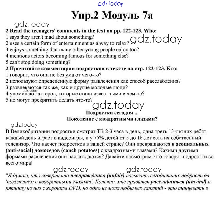 На страницах сайта gdz.today вы найдете учебный и вспомогательный материал, направленный на улучшения знаний школьной программы. ГДЗ - онлайн мир знаний Часть 7a Решение к Module 7 2 Учебнику по Английскому языку для 10 класса Афанасьева, Дули Просвещение Spotlight 2015