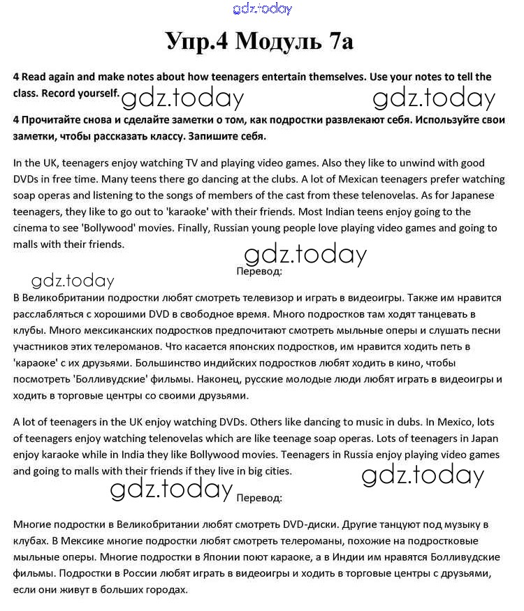 На страницах сайта gdz.today вы найдете учебный и вспомогательный материал, направленный на улучшения знаний школьной программы. ГДЗ - онлайн мир знаний Часть 7a Решение к Module 7 4 Учебнику по Английскому языку для 10 класса Афанасьева, Дули Просвещение Spotlight 2015
