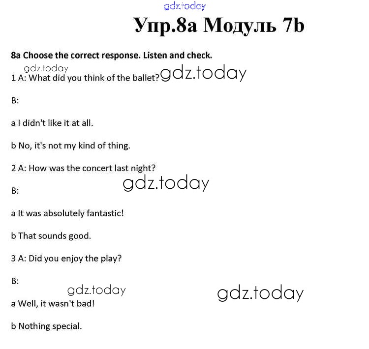 На страницах сайта gdz.today вы найдете учебный и вспомогательный материал, направленный на улучшения знаний школьной программы. ГДЗ - онлайн мир знаний Часть 7b Решение к Module 7 8a Учебнику по Английскому языку для 10 класса Афанасьева, Дули Просвещение Spotlight 2015