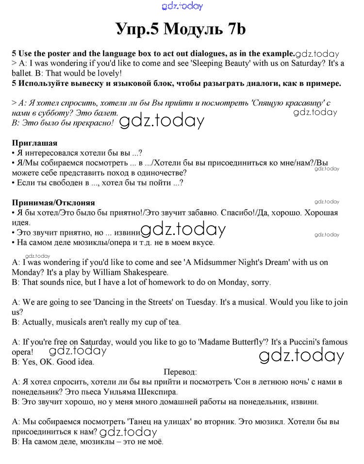 На страницах сайта gdz.today вы найдете учебный и вспомогательный материал, направленный на улучшения знаний школьной программы. ГДЗ - онлайн мир знаний Часть 7b Решение к Module 7 5 Учебнику по Английскому языку для 10 класса Афанасьева, Дули Просвещение Spotlight 2015