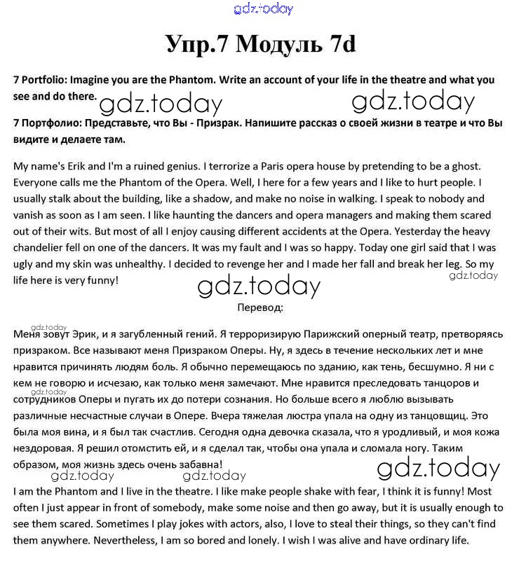 На страницах сайта gdz.today вы найдете учебный и вспомогательный материал, направленный на улучшения знаний школьной программы. ГДЗ - онлайн мир знаний Часть 7d Решение к Module 7 7 Учебнику по Английскому языку для 10 класса Афанасьева, Дули Просвещение Spotlight 2015