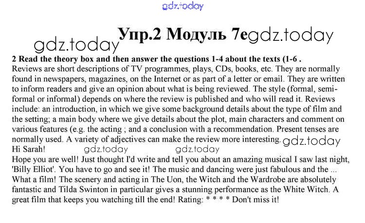 На страницах сайта gdz.today вы найдете учебный и вспомогательный материал, направленный на улучшения знаний школьной программы. ГДЗ - онлайн мир знаний Часть 7e Решение к Module 7 2 Учебнику по Английскому языку для 10 класса Афанасьева, Дули Просвещение Spotlight 2015