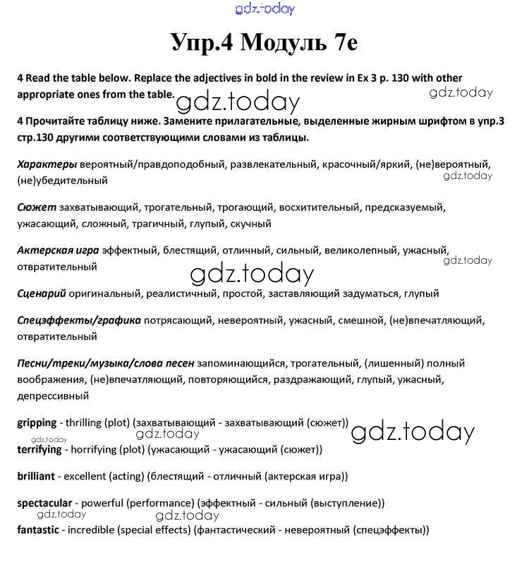 На страницах сайта gdz.today вы найдете учебный и вспомогательный материал, направленный на улучшения знаний школьной программы. ГДЗ - онлайн мир знаний Часть 7e Решение к Module 7 4 Учебнику по Английскому языку для 10 класса Афанасьева, Дули Просвещение Spotlight 2015