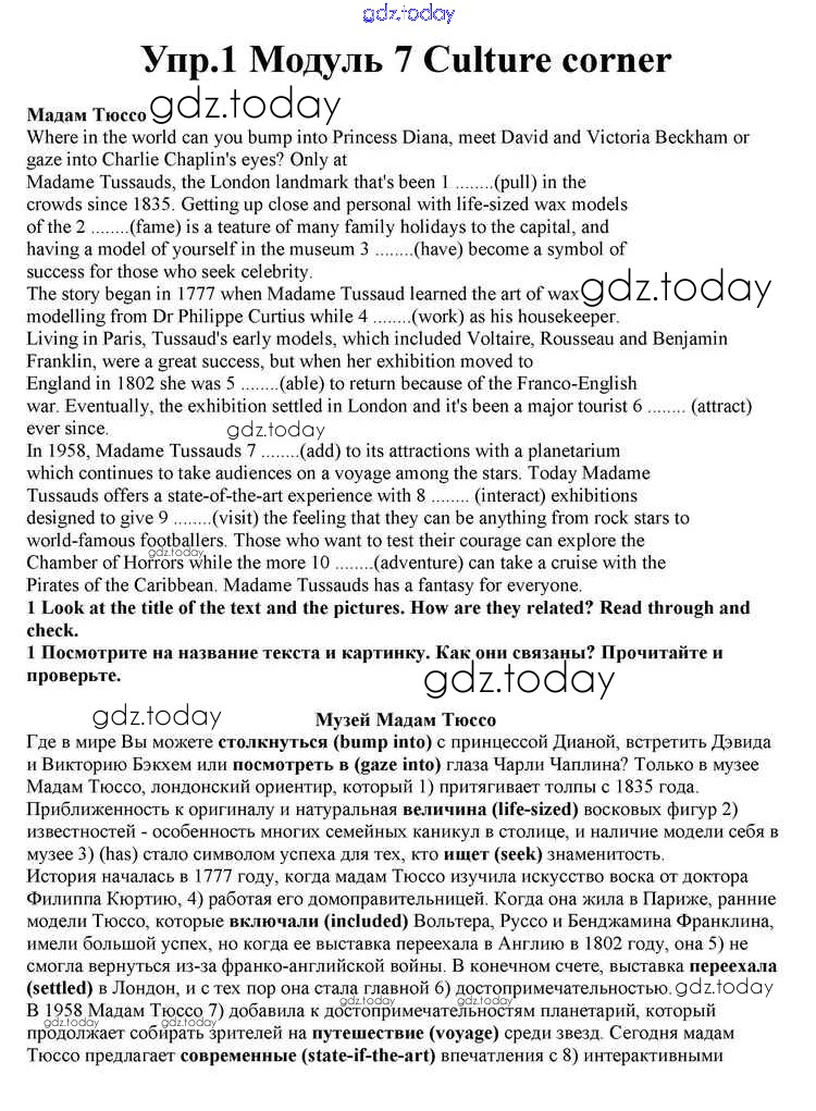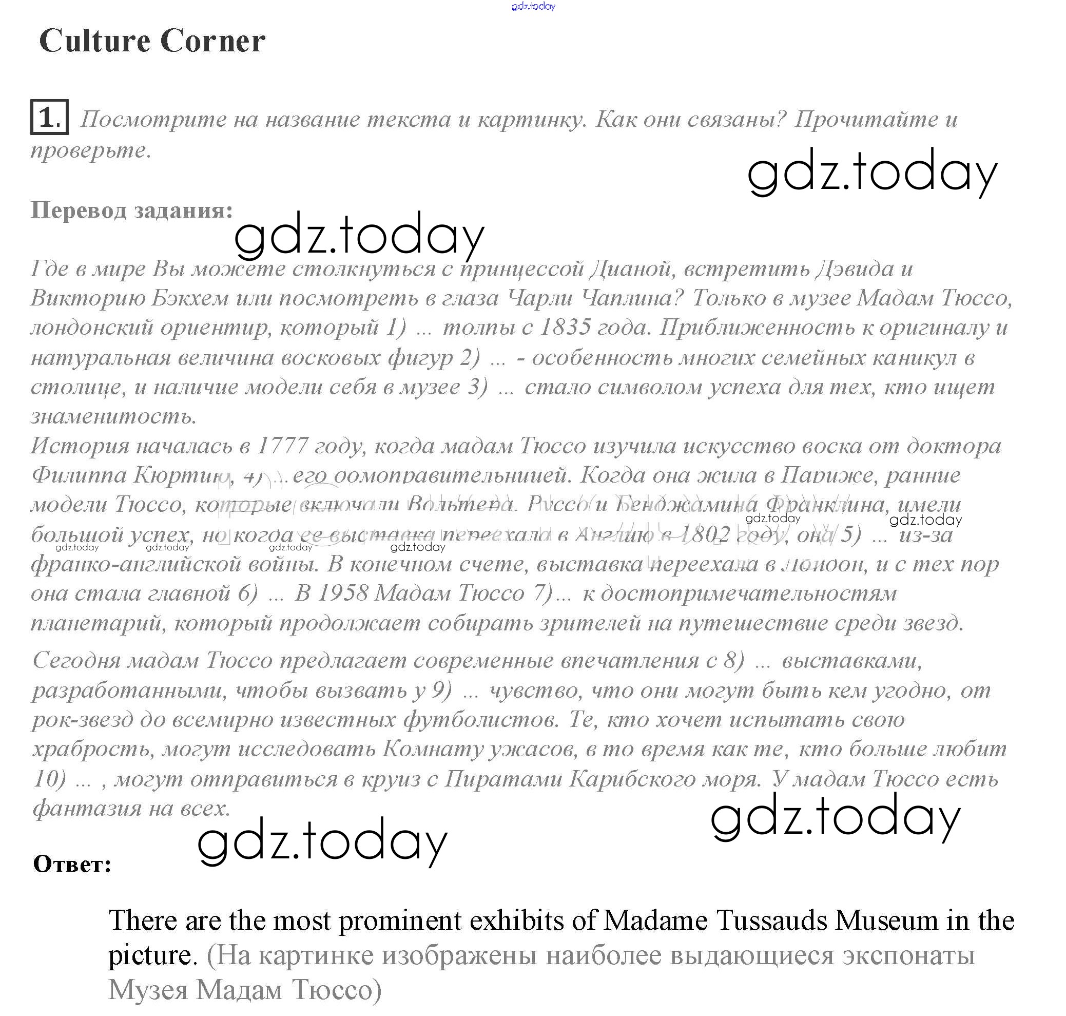 На страницах сайта gdz.today вы найдете учебный и вспомогательный материал, направленный на улучшения знаний школьной программы. ГДЗ - онлайн мир знаний Culture corner Решение к Module 7 1 Учебнику по Английскому языку для 10 класса Афанасьева, Дули Просвещение Spotlight 2015